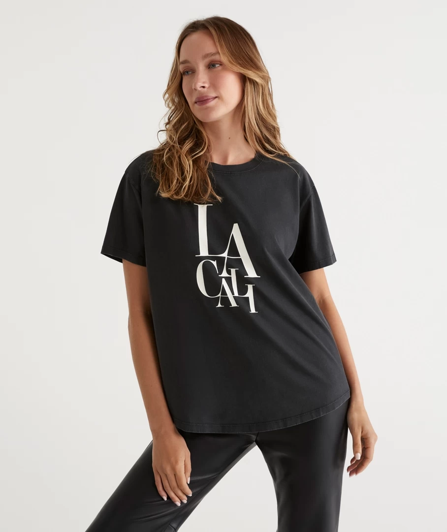 Pair this washed black 036070100% Australian Cotton LA logo tee with a pair of jeans to create an effortless casual chic outfit. Designed in Melbourne