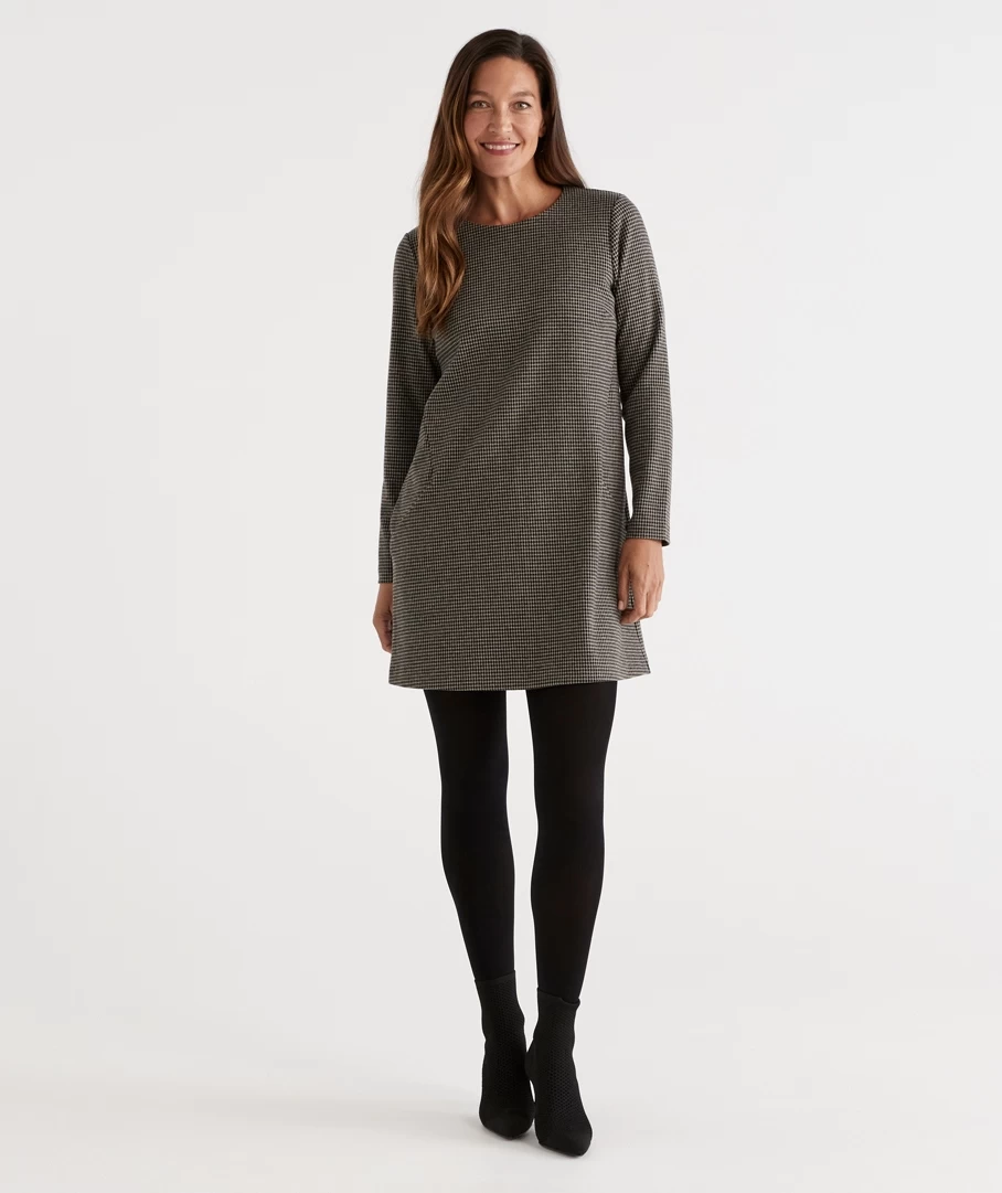 Elevate your wardrobe this season with this Longsleeve Houndstooth Tunic. This piece provides a beautiful silhouette while being practical and versatile to style with any outfit. Designed in Melbourne.