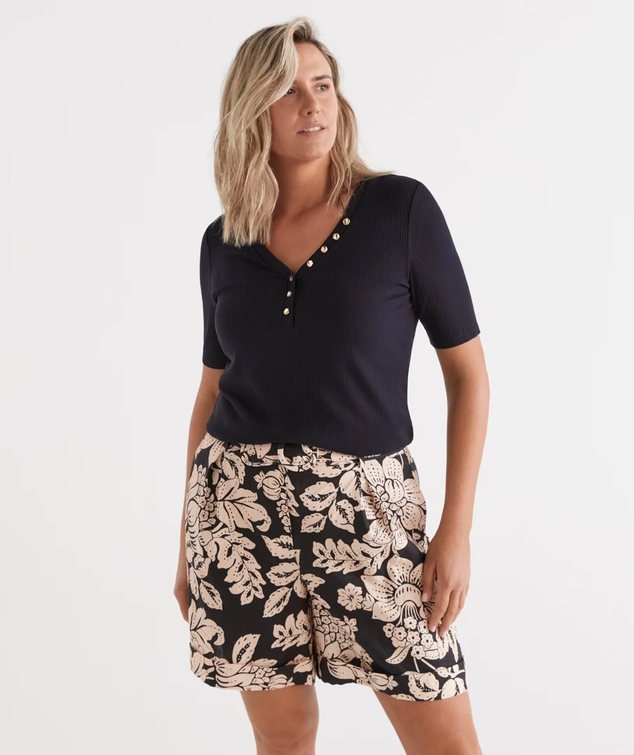 The rib henley tee is the perfect day to night top. With rib detailing and centre front button detailing. Elevate the look and pair with any skirt or pant.