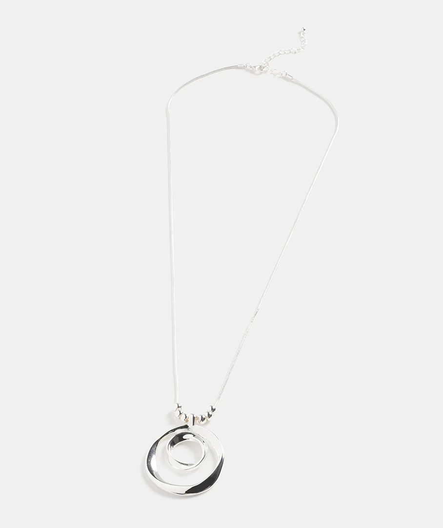 Our beautiful statement pendant is back in a subtle silver tone. This necklace will help elevate any look.