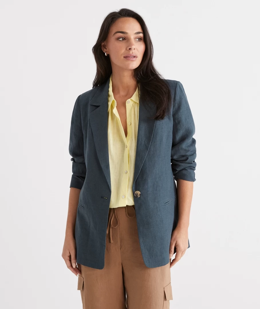 Our gorgeous single breasted linen blazer in classic opal tone, is a trans-seasonal piece which can be worn causally over a pair of jeans or for a more dressed look, paired with tailored pants and heels. Designed in Melbourne