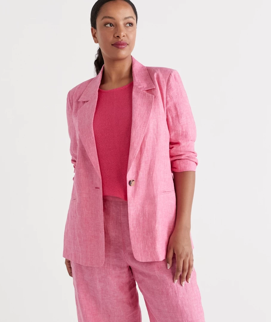 Our gorgeous single breasted linen blazer in statement pink tone, is a trans-seasonal piece which can be worn causally over a pair of jeans or for a more dressed look, paired with tailored pants and heels. Designed in Melbourne