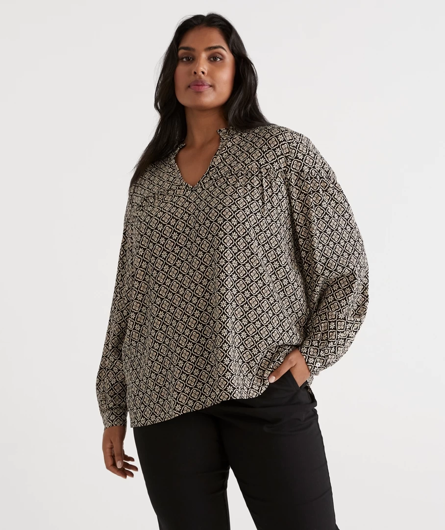 Made from a lightweight viscose fabric that drapes effortlessly, our Stamp Geo Top will easily take you from desk to dinner. Designed in Melbourne.