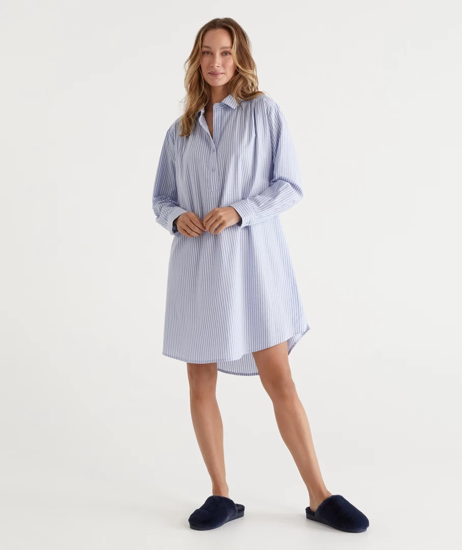 Sleep in comfort with our new relaxed silhouette ticking stripe night shirt. Crafted from a soft and breathable 100% cotton twill this style is the perfect piece for a great night sleep.